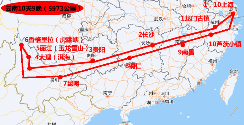 上海-长沙-贵阳-大理(洱海)-丽江(玉龙雪山)-香格里拉(虎跳峡)-昆明-铜仁-南昌-上海